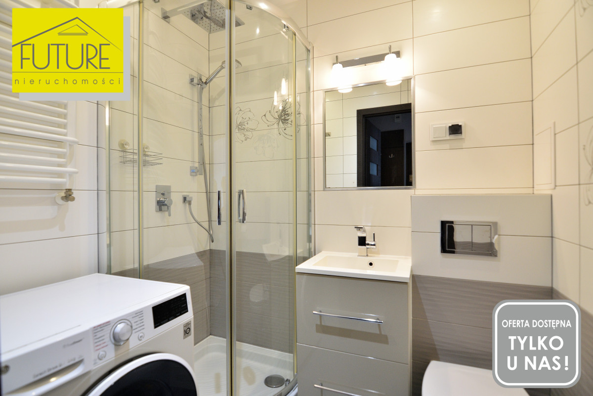 W kuchni pozostaje do użytku najemcy nowoczesna zabudowa kuchni, lodówka, zmywarka, piekarnik, stół z dwoma krzesłami.