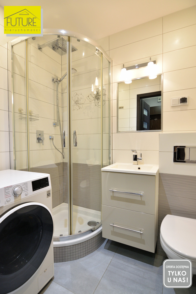 W łazience jest kabina prysznicowa, szafki, pralka.