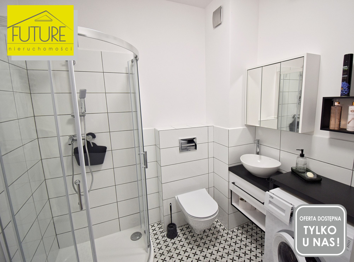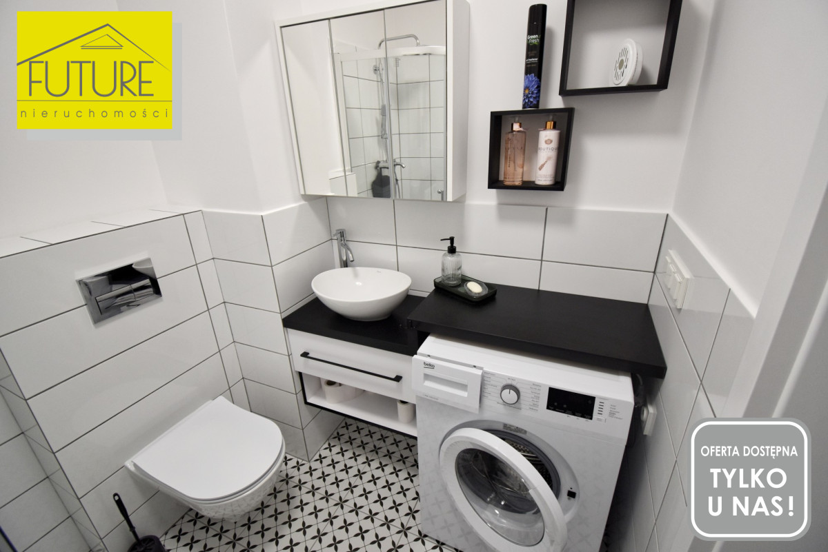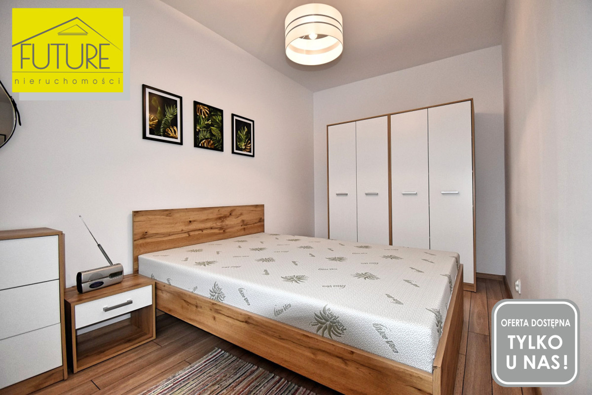 W salonie pełne wyposażenie wraz z telewizorem. Sypialnia utrzymana w jasnych kolorach w pełni umeblowana. Łazienka z kabiną prysznicową i deszczownicą nowe meble ,pralka.